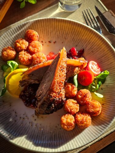 Aranybarnára sült libamell, röstiburgonya, vörösáfonya mártás (G,L)