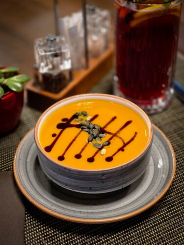 Sütőtökkrémleves, pirított tökmag, gyömbér (L,M)