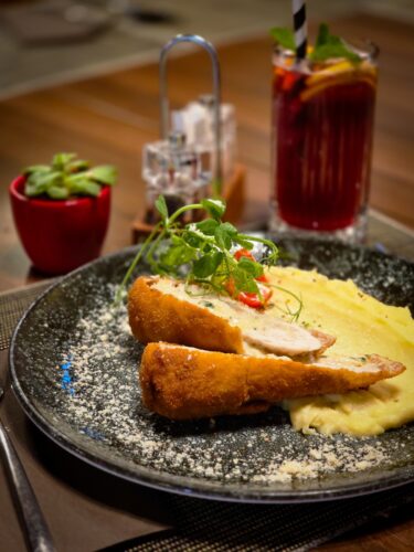 Fűszervajjal töltött pulykamell bécsi bundában, parmezános burgonyapüré (G,L)