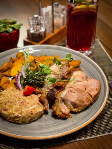 Ropogós csülök, bajor káposzta, rozmaringos burgonya (G)